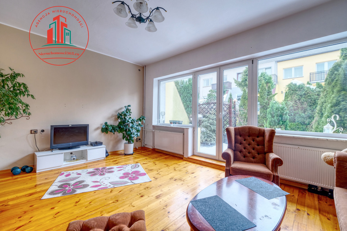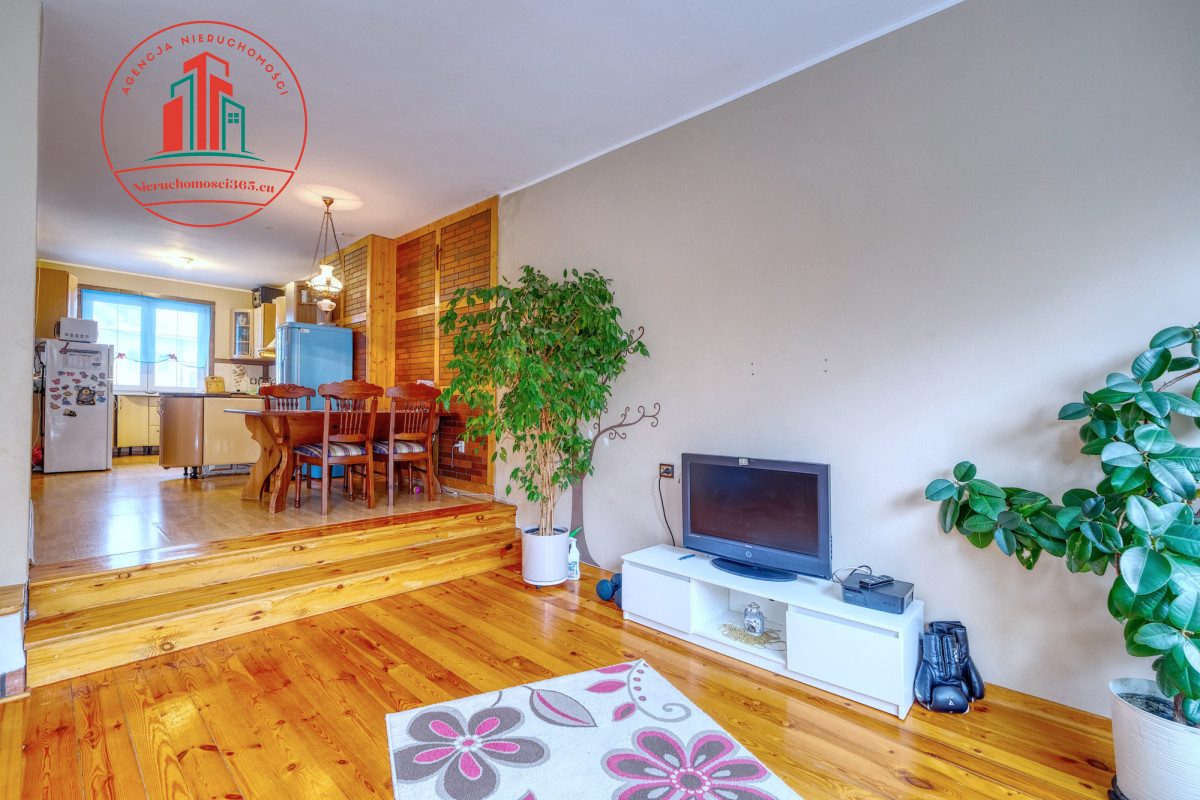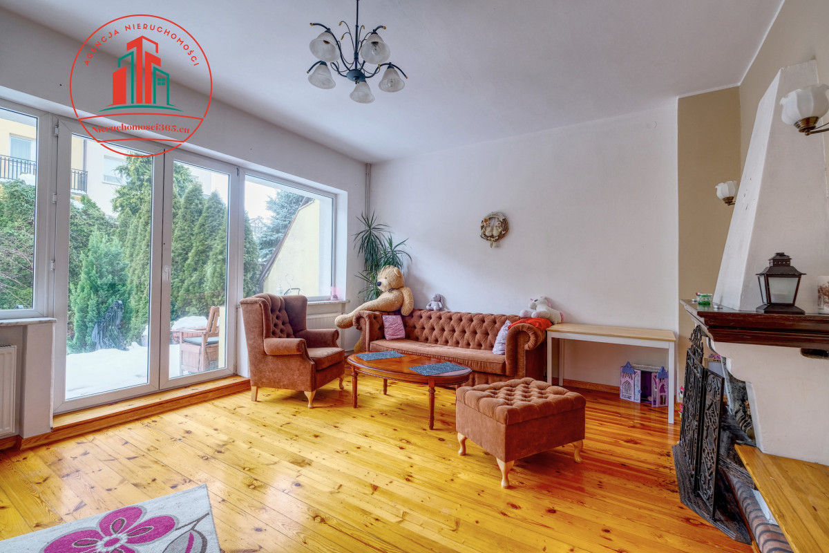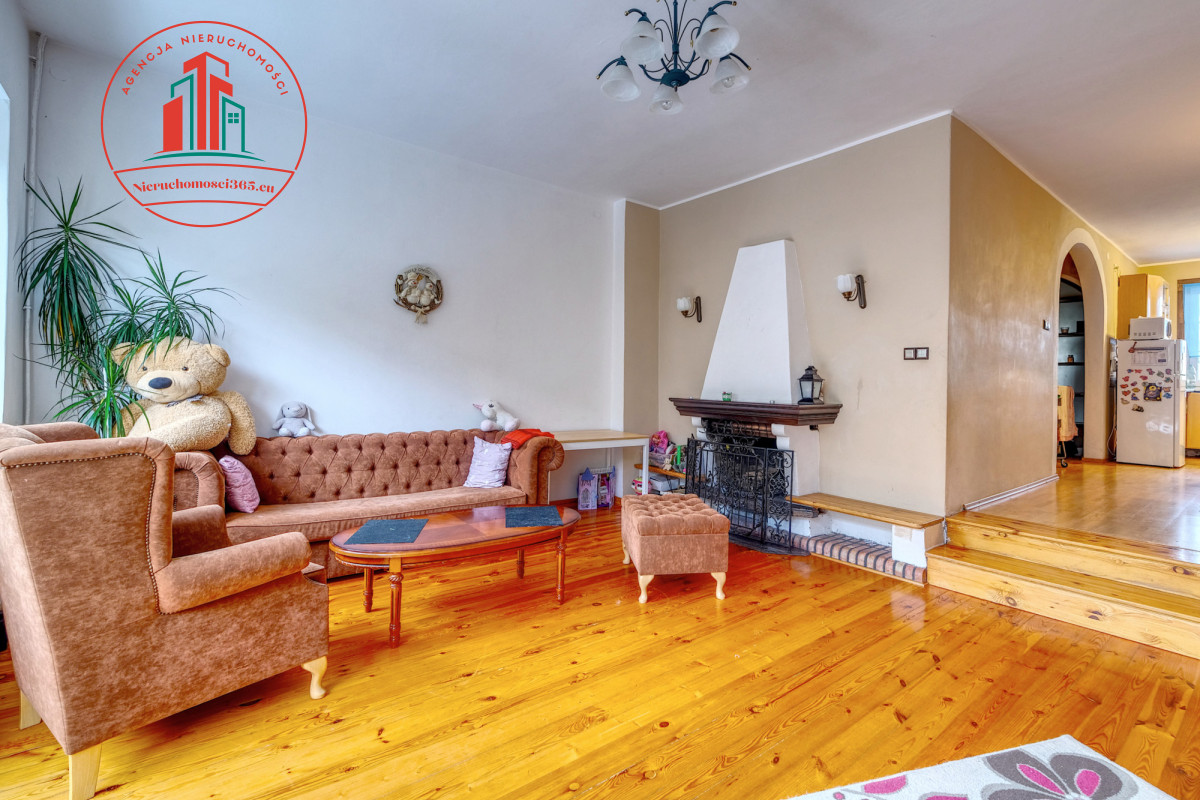 przestronny salon 40 m2 z kominkiem i wyjściem do ogródka, jasna duża kuchnia z jadalnią,