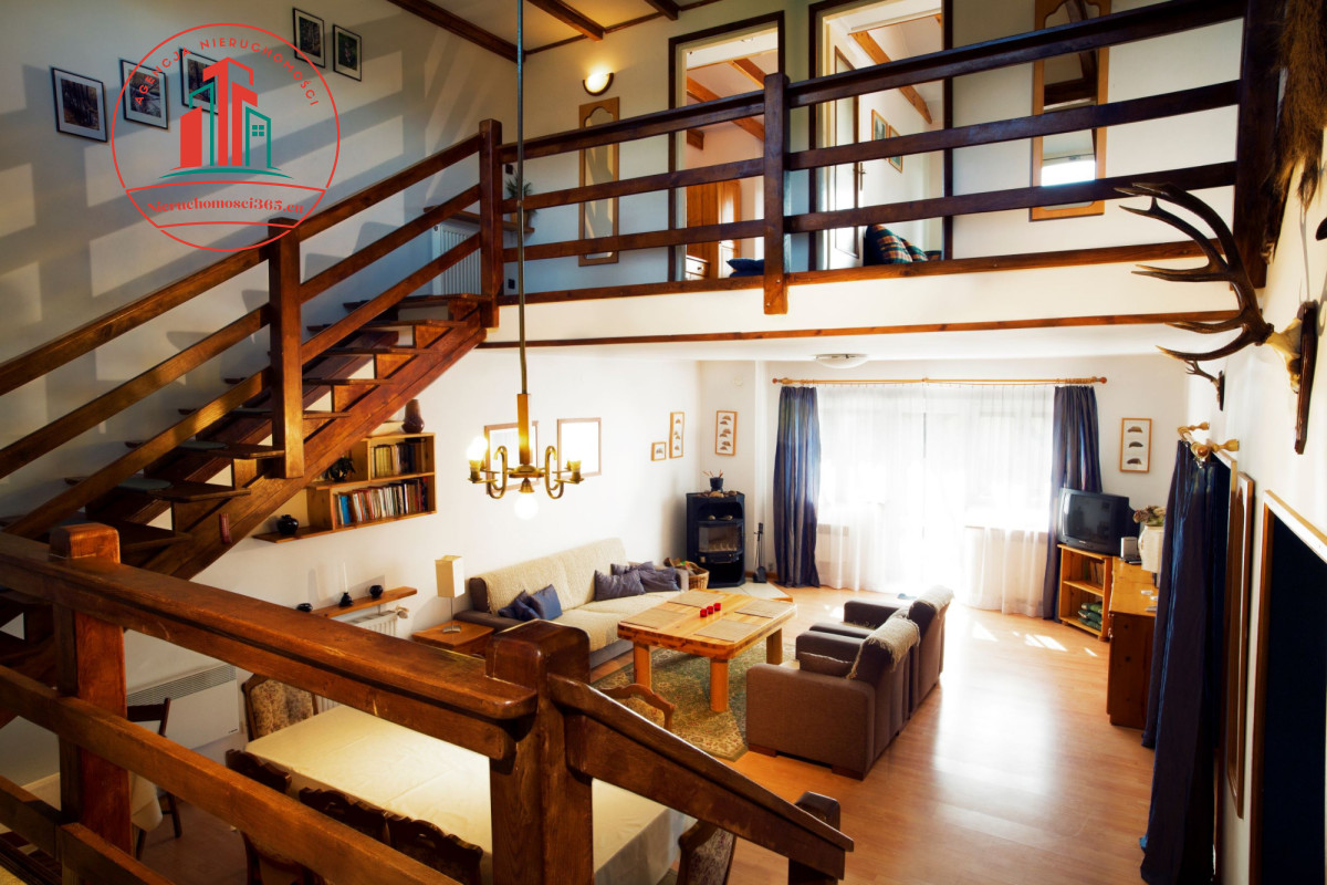 Trzy pokoje na pierwszym piętrze posiadają dodatkowo użytkowe poddasza (z oknami dachowymi),