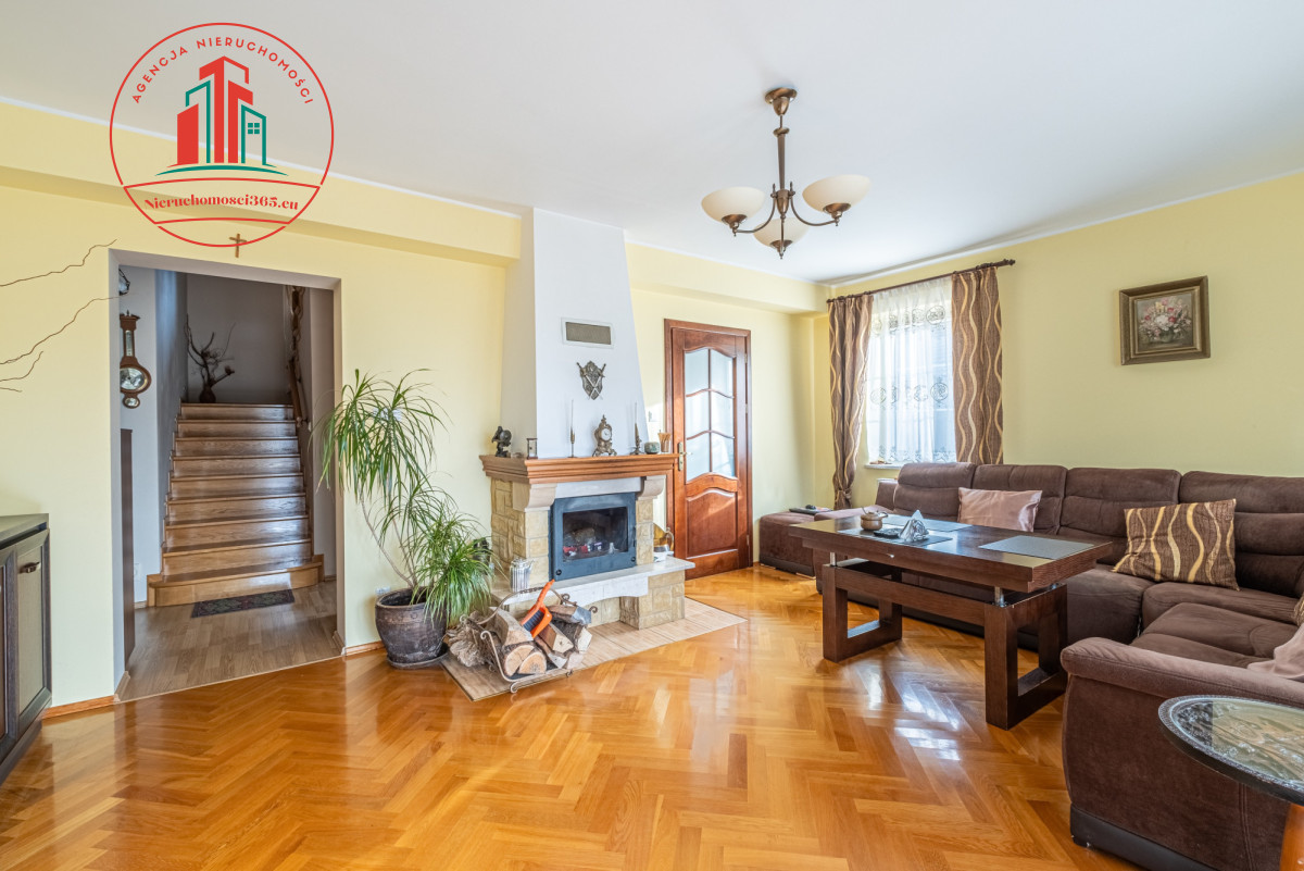 - Salon z kominkiem + wyjściem na taras